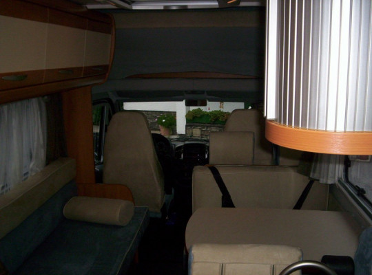 | Equipped with: | full dinette, air condition, external color silver blue, style world: Sardegna Bleu (including drivers and passenger seat), Camp GT Elegance plus package (instrument panel decoration set root wood, outside mirror electr. adjusted and heatable, central lock for cab, cruise control), Camp GT-package (additional window in the cabover left, panorama roof ventilator 50x80 double thermo glass with lighting, outside lamp with rain deflector, showering folding door, folding blinds for cab windows, moskito door, cabover heated), roof rack with ladder, flat screen mounting plate TFT 17inches, Airbag, awning 4 meters, Radio/CD, large garage-type storing department, if desired for extra price: bicycle-porter at the rear |
